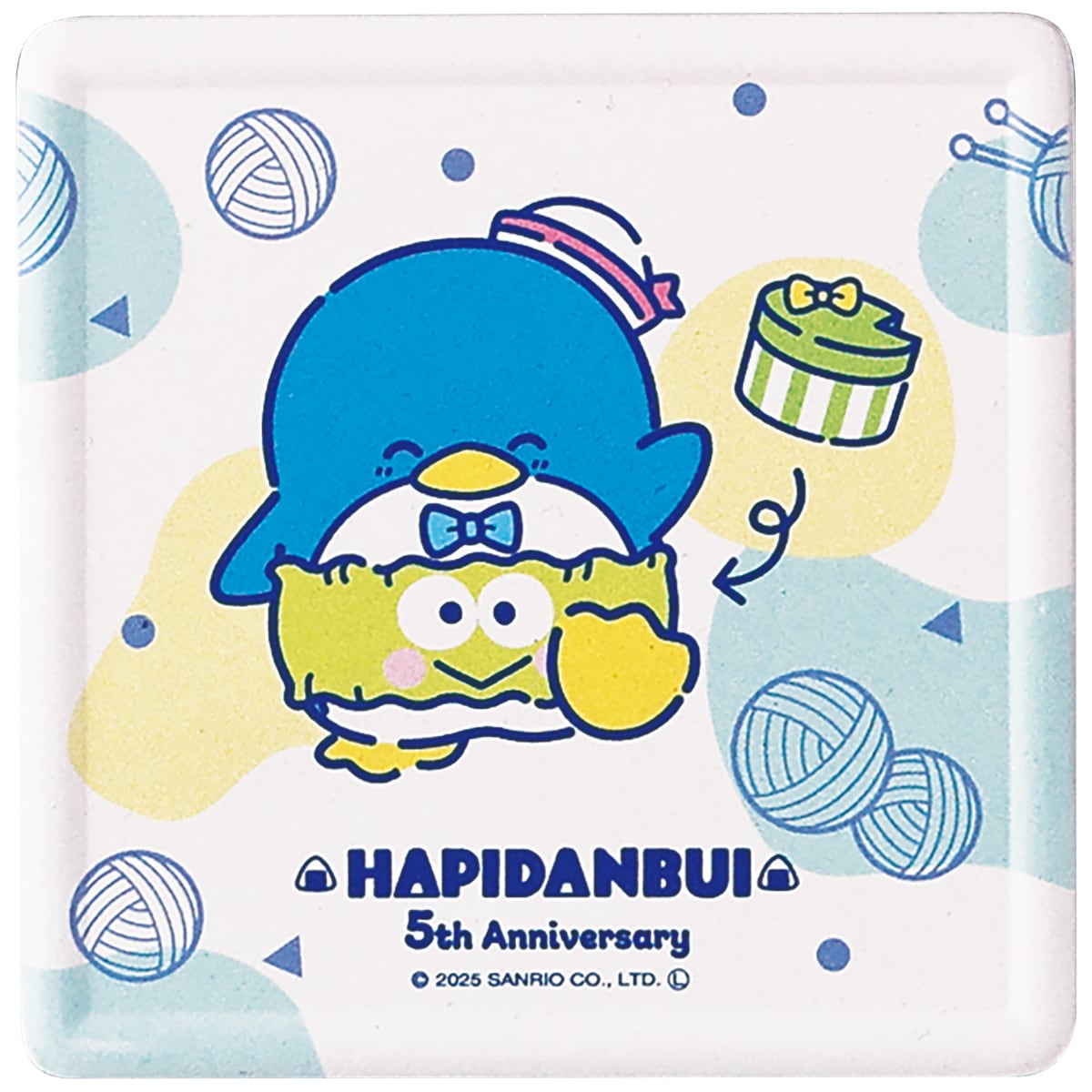 2025年ははぴだんぶいの結成5周年。お互いにプレゼントを贈り合ってる楽しいデザインです。キャラごとのコースターは6個並べると背景がつながる特別使用です。